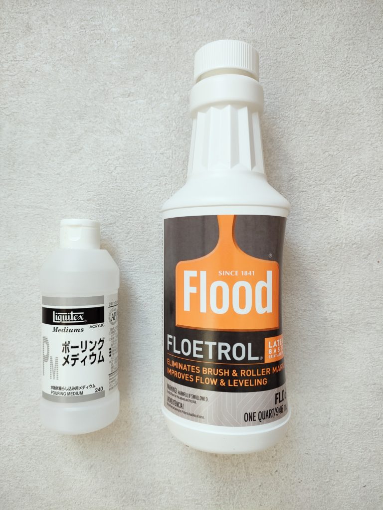 アクリル絵の具とお水だけでは美しいマーブル模様は描けません。メディウムという溶剤をアクリル絵の具に混ぜ合わせることで、絵の具同士が混ざり過ぎず、マーブル模様を描くことができます。メディウムにはポーリングメディウムとして販売されている市販品と、本来は別の用途で販売されている代用品があります。メディウムの種類が違うと使用分量や仕上がりの質感にも差がでます。
