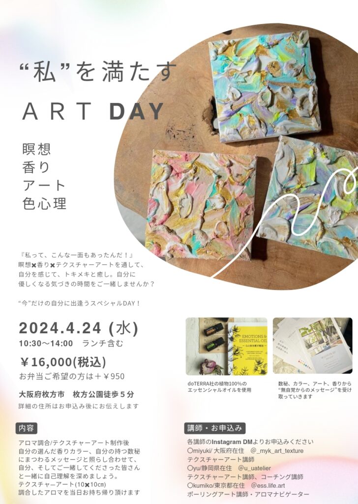 瞑想✖アート✖香り✖色心理から“自分を満たす”をテーマにしたコラボWSを開催します!